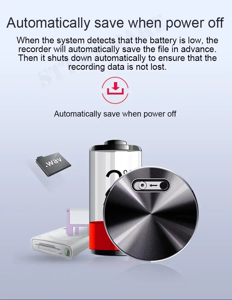 When the system detects that the battery is low, the recorder will automatically save the file in advance. Then it shuts down automatically to ensure that the recording data is not lost.