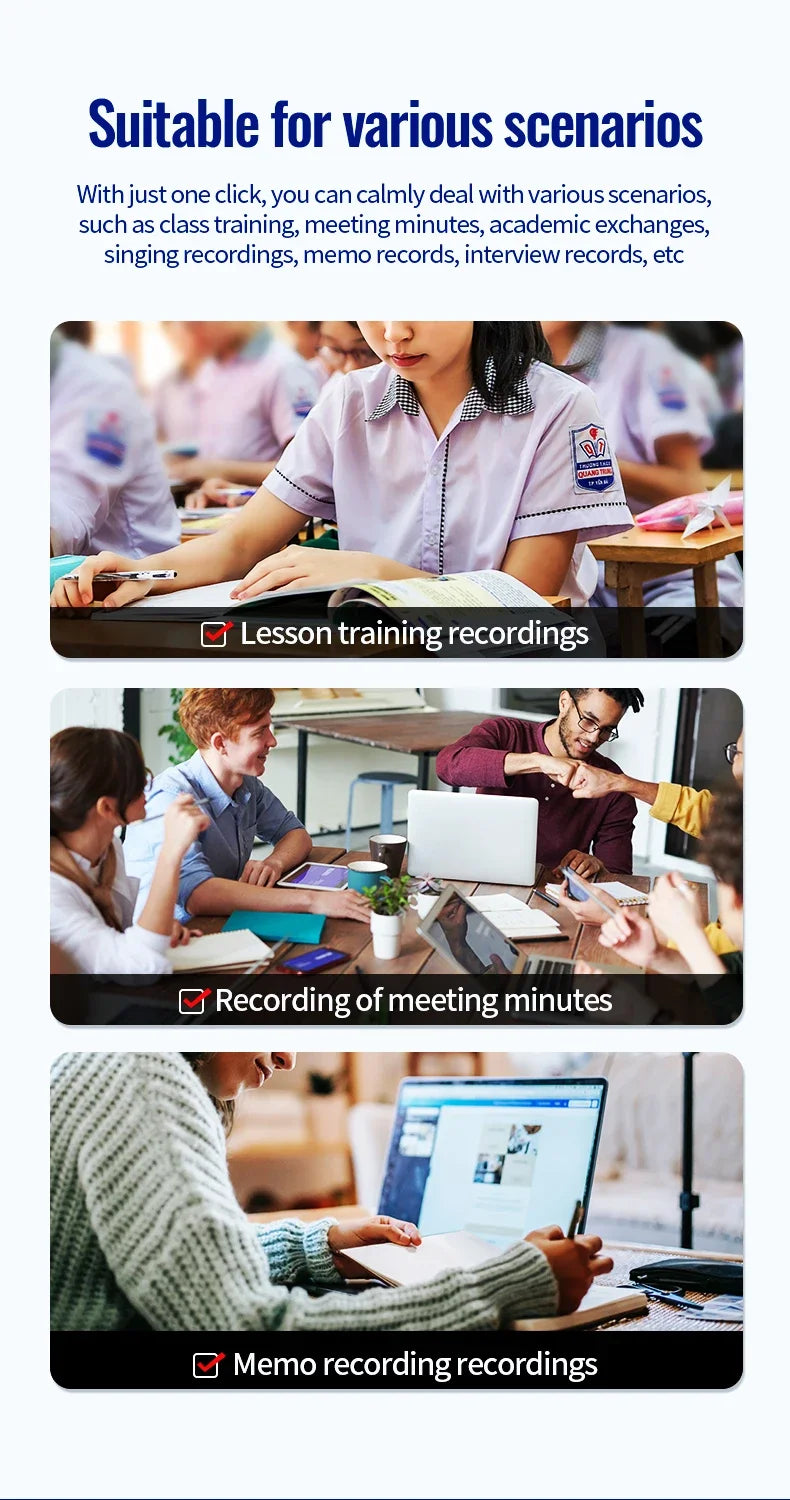 Suitable for various scenarios With just one click,you can calmly deal with various scenarios,such as class training,meeting minutes,academic exchanges,singing recordings,memo records,interview records,etc