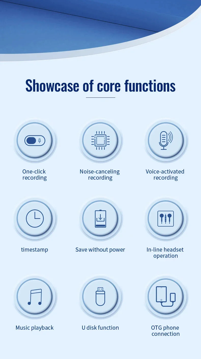 Lightweight, clever and powerful: One click recording, noise reduction, recording with built-in magnet, MP3 playback at any time, about 13 hours of continuous recording, voice to text conversion.
